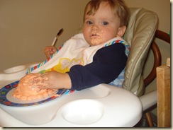 Well, the birthday festivities have begun, and will last another week and a half, culminating in Jack's airplane party when Gigi and Papa Jack fly into town. Tonight, however, we did the traditional 1st Birthday Dinner. Jack ate off of is very own new set of big boy plates, bowls, and silverware, having hamburger, baked beans, corn, and applesauce. Jack wore his special bib from Allie.