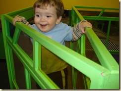 Then the boys discovered the infant/toddler room, while the big girls explored the water table room, Lego room, art room, sand box, etc. The boys never left this room because they loved it so much! It was full of stairs, ramps, tunnels a slide, bridge, and a kinds of stuff to climb on. Jack spent the rest of the day looking like this: